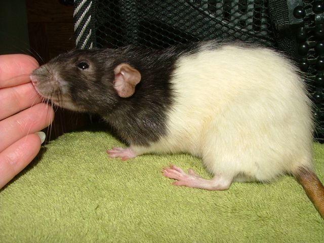 Ezzie was a leftover rescue from an adoption out of HH rescue. Her cagemates were adopted out but the morning of the adoption, an inguinal tumour was found so she was pulled from the group. I offered to take her, hoping she would be well enough as an older girl to have the tumour removed. Very quickly lovely Kate offered to pick her up and bring her to me on the bus. And once again Kate and I met at a subway stop to transfer rats. Unfortunately along with her age and the tumour, Ezzie also had a bad respiratory infection. I was going to see my mom that weekend, so brought little Ez with me so I could bond with her and continue her URI treatment. My mom loooved her and Ezzie was very sweet. licking and cuddling. :) Once I got her home though, she decided she would prefer to be more hands off and had a fantastic time running. In time I also got her in with my oldies crew where she made some new good friends from rats that normally didn't like other rats. :heart: