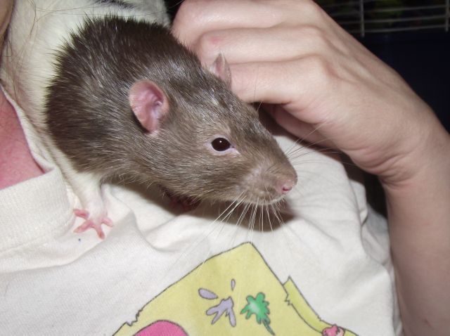 Unfortunately he was very protective of his girls...and if another rat went near their cage he was there at the side huffing and puffing at them. One Saturday I was home and looked up to see Joey standing stiffly on the shelf and when I went over I saw his mouth was FULL of blood. Later on we determined that he had tried to bite a rat outside of his cage and got his teeth stuck on the bars of his cage and freaked out and broke them off. Unfortunately after almost losing him, and finally getting metacam into him for pain and swelling, his whole muzzle swelled up. I got him into the vet as soon as I could and they diagnosed a fractured maxilla bone (nose), and it took a LONG time to heal and he always sneezed after that, but after being not himself for a good month, regained his fun, licky ways again.